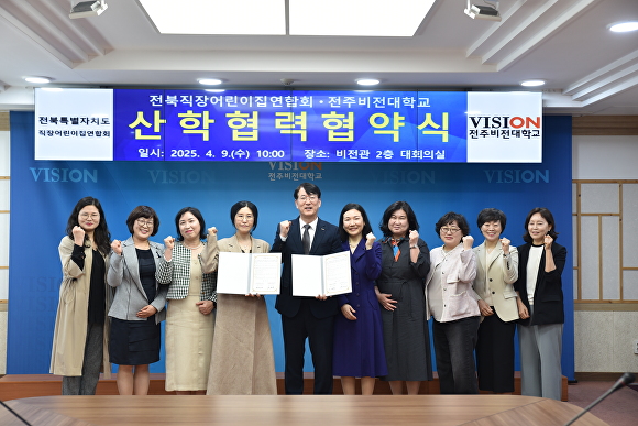 [아이뉴스24 박종수 기자] 전주비전대학교(총장 우병훈)는 지난 9일, 전북특별자치도 직장어린이집연합회와 산학협력 업무협약(MOU)을 체결하고 유아교육 분야 전문 인재 양성과 현장 맞춤형 교육 지원을 위한 상호 협력을 약속했다.