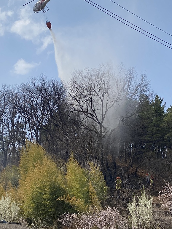 산림당국은 진화헬기 4대와 장비 38대, 인력 130여 명을 투입해 20여 분 만인 오후 2시 35분쯤 주불을 진화했다.