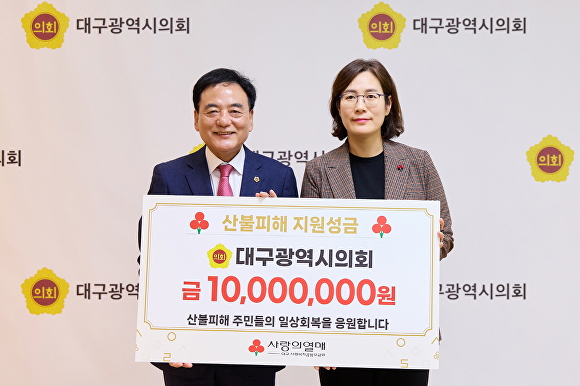 [아이뉴스24 이창재 기자] 대구광역시의회(의장 이만규)는 영남지역 산불피해 지역 복구 및 이재민 지원을 위해 대구시의원과 직원들이 자율적으로 모금한 성금 1000만원을 11일 오후 시의회 접견실에서 대구 사회복지공동모금회에 전달했다.