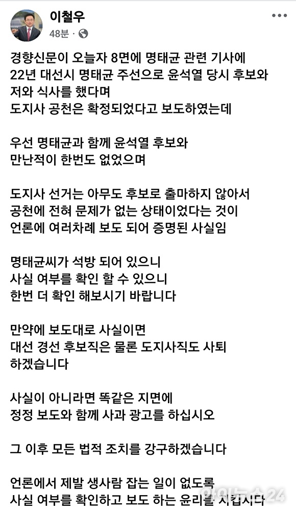 이 지사는 이날 게시글에서 “경향신문이 오늘자 8면 기사에서 2022년 대선 당시 명태균 씨의 주선으로 윤석열 당시 후보와 저(이철우 지사)가 식사를 했고, 이를 계기로 도지사 공천이 확정됐다고 보도했다”며 “그러나 명 씨와 함께 윤 후보를 만난 적은 단 한 번도 없다”고 반박했다.